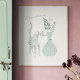 This stylish wall art features a pretty illustration of a gray cat standing next to a teal green vase filled with florals and botanicals. Personalize it with your name in handwritten script typography. Great gift for cat lovers.