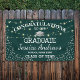 An stylish 'Congratulations to our Graduate' banner, featuring a green background that can be changed to any colour, string twinkle lights, silver glitter corners, a silver graduation cap and text that can easily be customised.