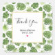 Wedding thank you stickers with a pretty pattern made up of green tropical leaves. Exotic and stylish design. A white square with a faux gold foil border layered over top with your text inside.