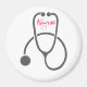 A magnet with "Nurse" written in a cool script font with a little pink heart underneath. Designed with a simple grey stethescope illustration.