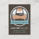 A stylish, hipster and cool take on the classic barber shop. It has a vector illustration of a masculine barber with strong arms and a beard who is wearing a simple white tee and a dark brown apron. The apron holds his hair cutting tools like comb and scissors for easy access. Color palette of brown, blue and white. For male barbers, hair stylists and hair salons who like an unique business card.