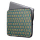 A stylish Laptop Sleeve, with a pattern of small red and green hearts on a dark teal background in a 'Folk Art' style. and black binding.