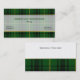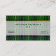 Stylish plaid business card done in the traditional green and yellow MacArthur Clan tartan pattern.  The front of the card has a gold tone edged semi transparent white band, across the middle of the card, with custom green and black text.  The back of the card is done in white, with a strip of plaid at the bottom, and black text on the white portion.  Personalise all the text to suit your needs.  Handsome and professional looking business card.