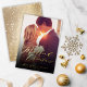 This modern and elegant real foil pressed holiday wedding announcement card features a 'Married Christmas' stylish calligraphy script with sparkling stars on a full bleed photo. The back of the card has a faux gold foil image background with white snow dots pattern.