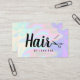 Gorgeous hairstylist business card design featuring colorful faux holographic texture and elegant calligraphy font.
