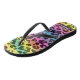 Trendy feminine flip flops featuring a stylish leopard spot pattern in rainbow colours; customisable by adding your name in white lettering on a dark purple label