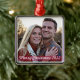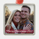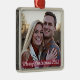 A stylish modern holiday photo ornament with a translucent red band. The script font greeting and year can be easily customised for a personal touch. This is a trendy, minimalist and contemporary design to stand out this holiday season! The image shown is for illustration purposes only to be replaced with your own photo. The placeholder image is of a happy young couple with a woodsy background. Create a memory each year with a new image for a lovely collectable keepsake.