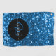 A golf towel decorated with a classic and elegant name and monogram in blue on a stylish black circle together with faux blue glitter.