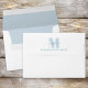 This design features a modern monogram simple return address, a minimalist minimal clean initial name, with a monogrammed back flap trendy stylish, and great for a family with whimsical typography font design, elegant simplistic script text, a clean contemporary modern design, a great modern school office home, simple light pale blue style, a stylish simple stationery design, a custom customise personalised envelope