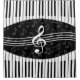 A stylish musical design in grey, black and white with a large treble clef in the centre with curved piano keys creating a border at the top and bottom of the design with a subtle pattern of grey musical notes in the background. An eye-catching music gift for the pianist, music lover or musician.