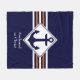 Stylish Navy Blue NAUTICAL Fleece Blanket, showing large anchor inside a white square at the centre. In the background are stripes in the colour of WHITE and TAN, set against a dark NAVY BLUE background. At the bottom is CUSTOMIZABLE TEXT which says ANCHORED IN CHRIST, which you can PERSONALIZE by adding your name or your boat name, etc.