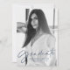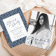 Invite guests to celebrate the grad with modern photo graduation party invitations. The elegant graduation party invitations feature the graduate's vertical photo with "Graduate" in a stylish navy script overlay. Personalise the front of the photo graduation party invites by adding the graduate's name, school name, and graduation year. The back of the invite features your graduation party details with a hand-drawn navy and white pattern background.