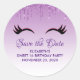 Save the date stickers with a trendy stylish design. The background is a purple gradient colour with an image of faux sparkling glitter dripping down from the top. A pair of girly cute eyelashes underneath the glitter image.