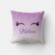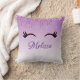 A personalised pillow with a trendy stylish design. The background is a purple gradient colour with an image of faux sparkling glitter dripping down from the top. A pair of girly cute eyelashes underneath the glitter image.