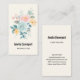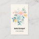 Business cards with a pretty watercolor illustration. A flower bouquet with pink and blue flowers surrounded by green leaves and sprigs.