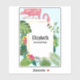 Vinyl decal / contour sticker with a cute and whimsical pink flamingo. Surrounded by green tropical leaves, and red and yellow hibiscus flowers. A rectangle shaped, gold gradient frame in the centre.