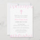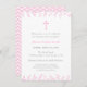 A modern and stylish Christening or Baptism invitation in pastel pink. Design has the holy cross in the centre and decorative leaves for the border. On the reverse page is a pastel pink and white chevron zigzag pattern. Personalise easily with event details for baptism of baby girl.