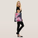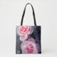 Tote bag with pink roses design on dark background.