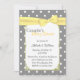 Stylish couple's baby shower invitation done in a light grey and white polka dot pattern. Graphics of a pale yellow decorative edged white text area, in the middle, has a pretty pale yellow ribbon and bow, at the top. The backside is done in the same polka dot pattern, with another white text area, at the bottom. Personalise all the text, front and back to suit your event needs.