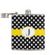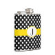 Stylish feminine flask done in a black and white polka dot patterned, with a bright yellow band, around the middle of the flask. Graphics of a yellow scalloped edge oval white monogram plaque, on the middle front of the flask, has a black one letter monogram. Personalise the monogram for yourself or as a lovely gift idea.