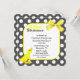 Cute baby shower invitation, done in a grey and white polka dot pattern, with a yellow edged white text area, on the front. Graphics of a yellow satin looking bow decorates the top right corner and a cute cartoon yellow ducky, is on the left bottom. Text in yellow, black, and grey is ready to personalise to suit your shower party needs. Very sweet invitation that is gender neutral or good for twins.