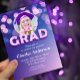 A sleek and modern graduation design featuring a rich purple-to-pink gradient background with a dreamy bokeh light effect. The bold "GRAD" text stands out with a glossy 3D effect, adding depth and vibrancy. A circular frame at the top elegantly showcases the graduate’s photo, complemented by soft floral accents. The layout is polished and celebratory, making it perfect for a memorable graduation event.