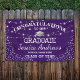 An stylish 'Congratulations to our Graduate' banner, featuring a purple background that can be changed to any colour, string twinkle lights, silver glitter corners, a silver graduation cap and text that can easily be customised.