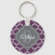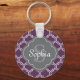 Trendy Moroccan inspired tile trellis pattern in purple and white with a gray quatrefoil label frame featuring customizable name and monogram templates.