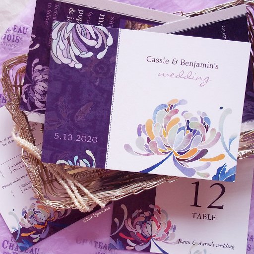 Colourful, elegant chrysanthemum flowers in grey & purple shades + rustic plum wide stripe designed on custom Wedding Reply Postcards. ((You can find the matching wedding essentials & favours in this store, Bridal Heaven. Contact ujean4791@gmail.com for custom work and/or coordinating wedding stationery.))