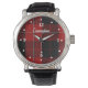 Stylish leather strap wrist watch, with the classic red, black, and white clan Cunningham tartan plaid pattern, on the face, with white numbers and dots for the hours. White custom text reads Cunningham, and can be personalised to read what you want.