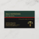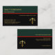 The upper green layer has your prestigious name and job title. Towards the right wall is a slogan caption "the lawyer's pen is mightier than the sword" ; change the caption remarks to suit your needs. Below the caption is a gold scales of justice logo with an underlying pen nib design. The business name and contact details are at the lower left corner of the card.