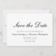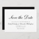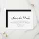 This classy formal wedding save the date card features elegant, stylish black script and small capital fonts on a white background. The reverse is solid black.
