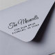 Return address stamp featuring your family name in a stylish script and your address in simple typography.