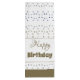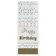 Tall paper gift bag with handles, tote style with all over star print in silver grey taupe and blue. The white background and accent stripe can be switched to any colour to coordinate with your style, and the happy birthday text can be personalised to suit any special occasion.