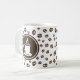 © Sunny Mars Designs. Tall Steaming Cup of Coffee with Coffee Beans Mug - Trendy coffee mug featuring a cute tall mug of coffee and saucers with steam coming out of it and coffee beans pattern background vector illustration.