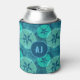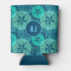 Stylish beachy can cooler printed with teal blue and aqua sand dollars and sea shells over an ocean blue background. There's a customisable monogram area front and back for you to add your own initials