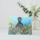 Stylish postcard features vintage octopus illustration overlay on abstract aqua nautical background