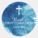 Modern blue watercolor with a white First Holy Communion sticker or envelope seal