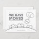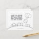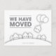 Customise this Stylish Clean New address Announcement Postcard featuring a lovely designed original image made with white houses and shadows, one of the houses is high up in the air as it is attached on three balloons which are taking it to a new place. On the left side is modern big grey text: "We have moved". Under the image is customisable text: "Visit us soon!". Make sure to customise all the text on the front and on the back side of this postcard. Very contemporary and minimalistic design, perfect also for your business.