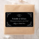 Custom black and white wedding wine or spring water bottle labels. Personalised elegant waterbottle sticker template with interlocking hearts and stylish border with swirly swirls. Fancy script typography for names of bride and groom and thank you message. Use as classy table decoration or thank you favour for guests at the party. Includes name or monogram plus date of marriage. Romantic vintage design with beautiful corners. Also good for retro theme weddings. Create your own natural mineral waterbottle labels with this classy DIY template. Customisable background colour.