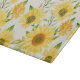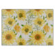 Illustration style graphic of yellow sunflowers with leaves and stems on white background, seamless repeat pattern