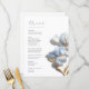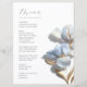 This bas relief wedding menu card features light blue and gold 3D textured lily flowers and an elegant handwritten script on a white background.