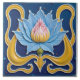 A square tile with a blue background features a stylized lotus flower in the center, with yellow ribbons framing the flower on either side. The lotus has blue outer petals, a yellow middle section, and a pink center with white tips. The ribbons are thick and curved, with a white outline. The tile has a glossy finish and a slightly raised texture.