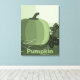 A stylized green pumpkin autumn canvas print shows the squash lying on straw and leaves. The digital artwork is perfect as a Thanksgiving wall-hanging home decor gift.