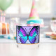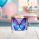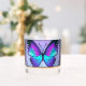 A vibrant butterfly with shades of blue and purple is centred within an ornate circular design, surrounded by intricate floral patterns and decorative jewels. The overall composition exudes a stained glass aesthetic with a harmonious blend of colours and symmetry.