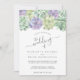 Botanical wedding invitation with a top border consisting of green and purple watercolor succulents and the words, "the wedding of" in a pretty script. Below are your details in a soft grey font. The backside has a green watercolor wash. The succulents add a great natural element to the design. These invitations are perfect for a desert wedding in the spring or summer.