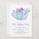 Succulents birthday party invitation. Invite features violet purple and blue succulent cactus and floral pattern.