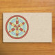 This design is based on a mediaeval apotropaic (protective) symbol carved in stone inside a church in Worlington, Suffolk, England. Here the symbol features hues based on the palette of colours from the Bayeux tapestry.