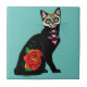 A black cat with day of the dead sugar skull make-up on in a backdrop of teal