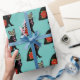 A black cat with day of the dead sugar skull make-up on in a backdrop of teal